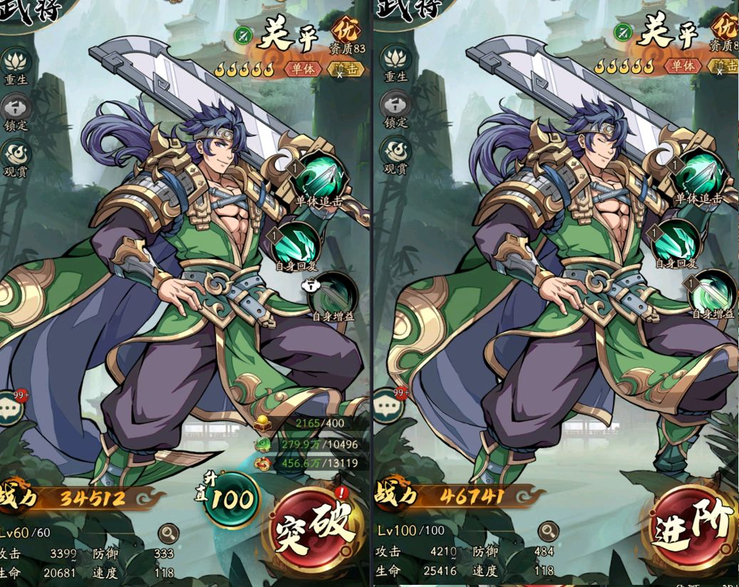 因为武将的等级,与其攻击、防御和生命直接挂钩。以关平为例,100级关平的属性,除速度外比60级时提升30%。这样一来或许战力比地方稍低,但实战中却可以凭借属性优势快速击杀敌方。