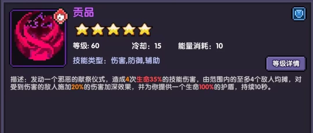 【刺壳】获得流血或者对敌人施加流血时获得一层刺壳,上限30层,共266%普攻伤害加成。