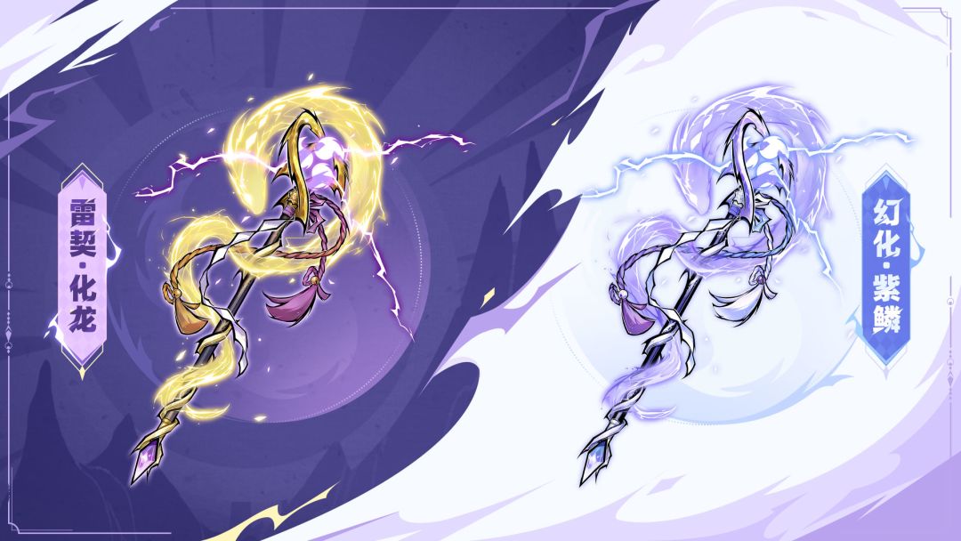 如果说,「紫电白虹」代表着百年来腾蛇一族传承的使命,那么「雷契·化龙」则被寄予了腾蛇一族未来的心愿——祭剑师们可摆脱祖制枷锁,停止无休止的牺牲。那是紫原第一次主持腾蛇祭祀大典,祭词唱罢,圣兽现世,无数金光自衣冠冢飞出,汇聚于法杖之上——「雷契·化龙」于众人瞩目下震撼降世,气势非凡!族人都道:此乃十年不遇之奇景!紫原果真是腾蛇一族的未来!唯有紫原知晓,圣兽·腾蛇亦有改变腾蛇宿命的心愿。