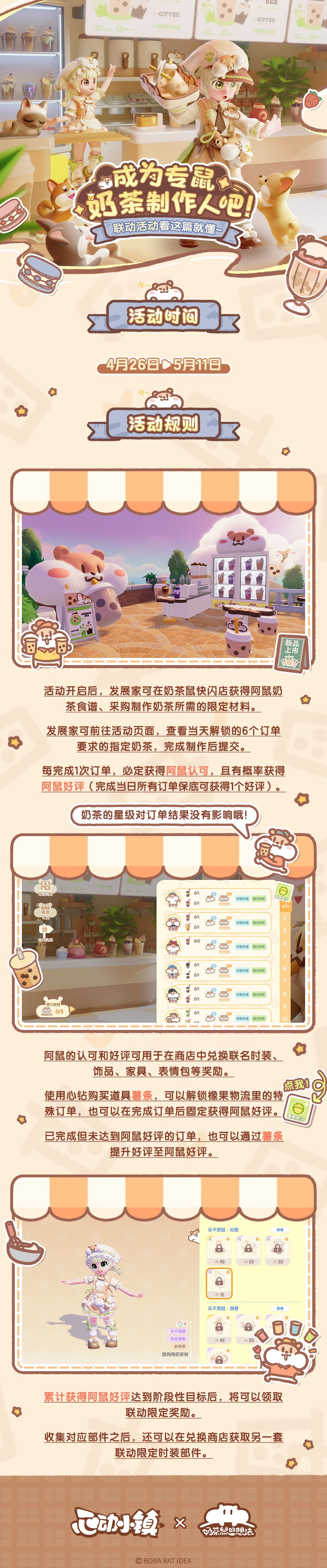 4月26日至5月11日,奶茶鼠的想法联动即将开启,和鼠一起开间奶茶店吧~