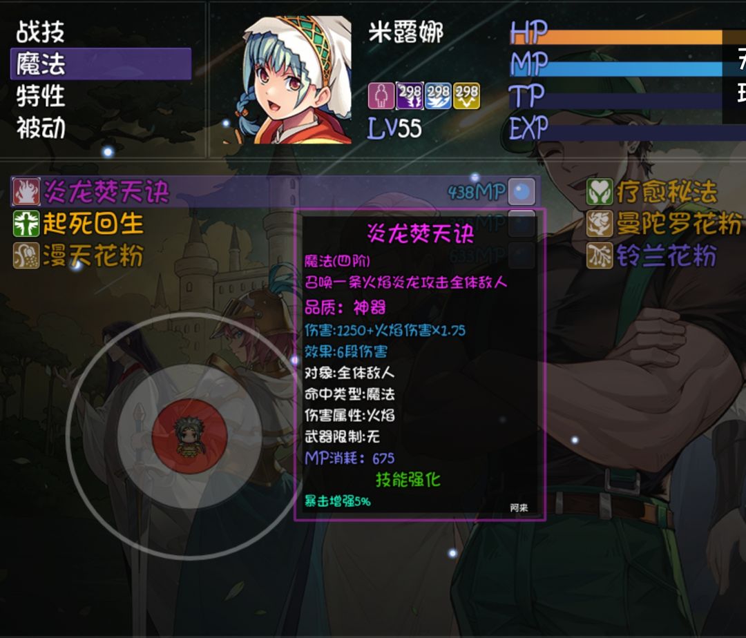 2.阵容搭配就不说了吧,阵容是1个C1个点火2奶,前期找拿剑的点火剑天赋凑技能连击充当打火机(我选的是紫霞、曹操,其他没试过。手游不知道是吞伤害嘛感觉也就打个3-5次横扫千军,感觉很鸡肋),后期我就弃火剑了,直接带一个能打六段的四阶魔法炎龙焚天决(19层深渊挖掘秘籍出)这个多段稳定打六段横扫,而且奶妈也能带,就是有点费蓝,所以我搭配了莱利和瑞普回蓝。