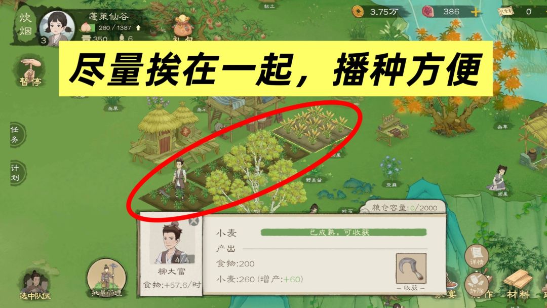 1. 进游戏跟着指引走,等到能自由活动的时候,再建造几块农田,前期有四块田即可,建造太多了人手也不够,尽量用劳力高的人去管理农田,我用的是柳大富