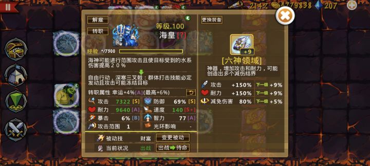 海神技能:增强水系伤害20%,可能进行范围攻击。