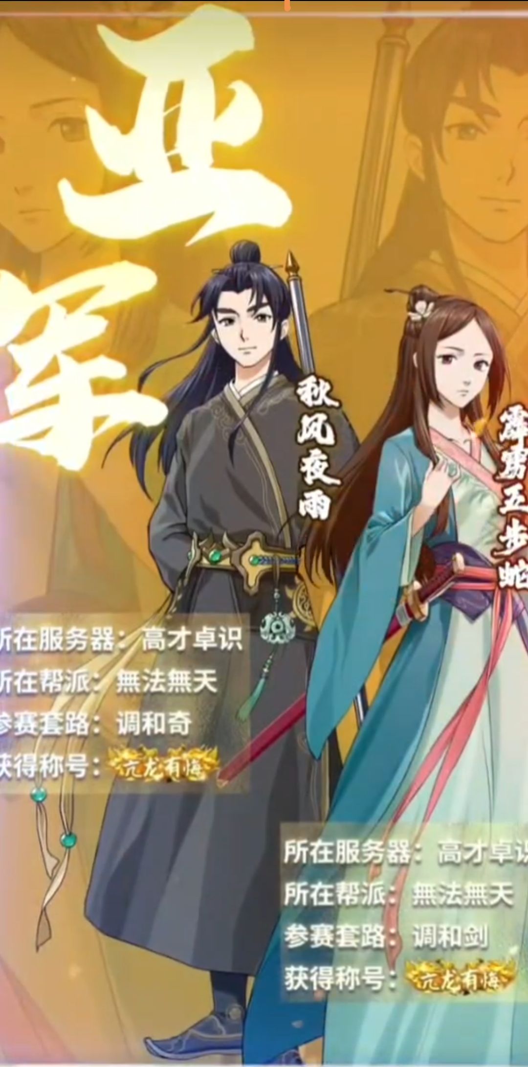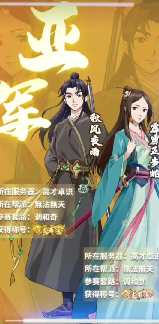 组合介绍:我们是来自卧虎藏龙大区高才卓识游戏区的调和奇选手秋风夜雨和调和剑选手霹雳五步蛇,是硕果仅存的唯二原纵横驰骋区一手号玩家(差点成独苗,抖音赛活动前五步蛇都已沉迷三谋离线3天了,应召参加抖音赛现氪1.6w开发七星烟霞剑),此次比赛取得了超预期结果,两人都是一路爆冷取得了超预期的积分,下面分享部分比赛精彩片段,也当记录此次携手战斗的美好回忆。