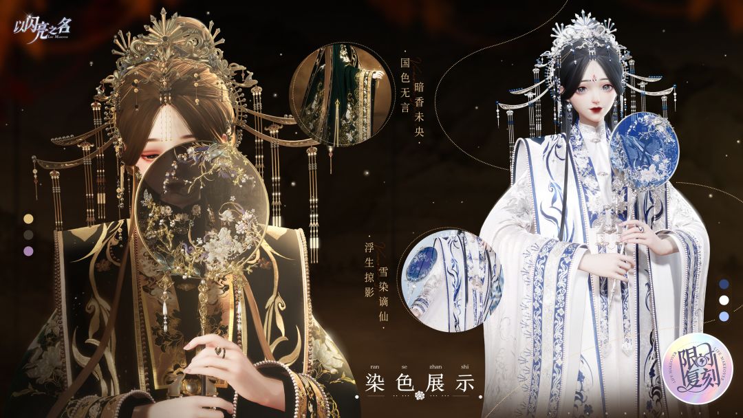 连衣裙【鸾俦夙缘】染色区1拆分优化至染色区6-8,染色区2拆分优化至染色区9,染色区3拆分优化至染色区10,染色区4拆分优化至染色区11-12,可对更多图案配饰进行分区染色;外套【流霞染帔】新增染色区7-8;手持物【萤扇轻罗】新增染色区6-8。细节拉满,给你最极致的染色体验!