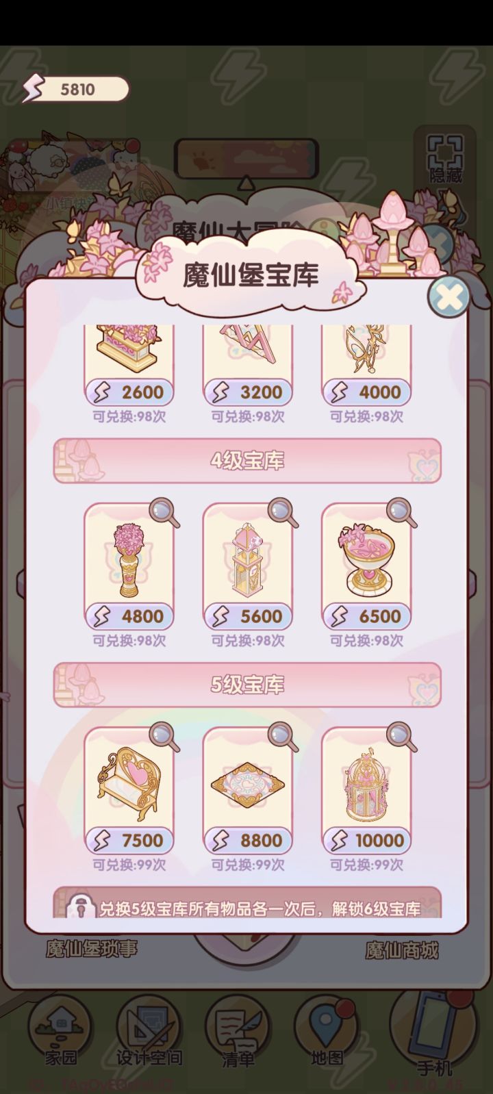 目前到5级宝库兑换完需要的能量为50100(稿主有花蓝币所以开到5级了),没有看出兑换值增加的规律。下面还有9个。