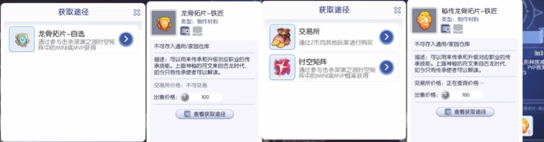 龙脊契刻≈秘传龙脊契刻,龙骨拓片≈秘传龙骨拓片,后者可交易