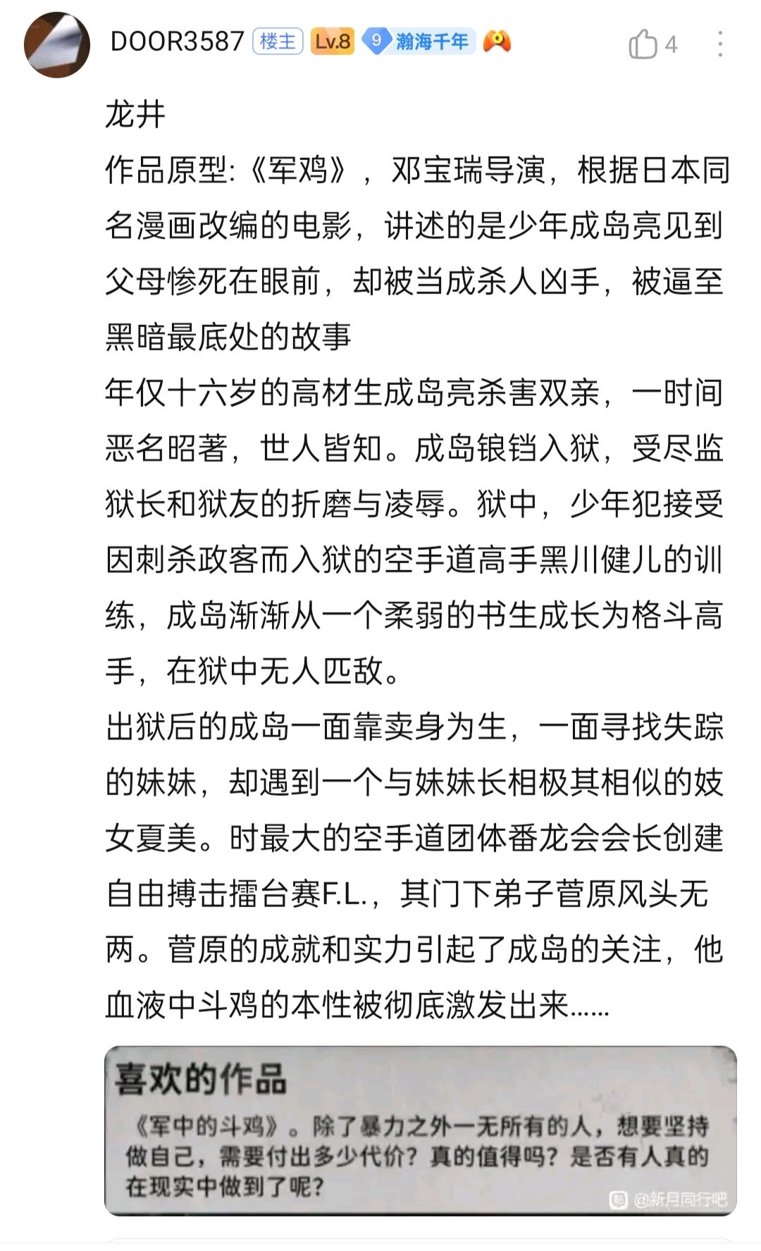 P5-6,喜欢的作品《军中的斗鸡》➡️《军鸡》,香港电影,讲述的是少年成岛亮见到父母惨死在眼前,却被当成杀人凶手,被逼至黑暗最底处的故事。
