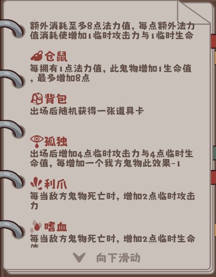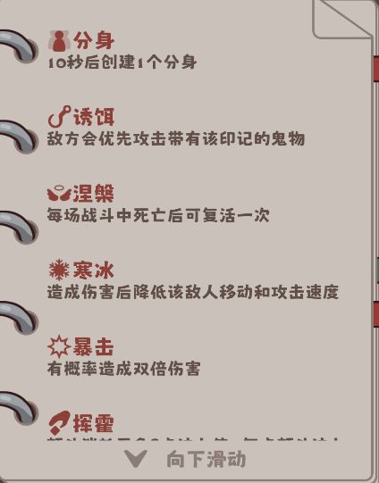 (3)刻印,鬼物身上的特殊效果。每个鬼物都会与生俱来一个刻印,可以通过对局内过程中的“献祭”“缝合”等形式,增加或改变鬼物所拥有刻印。刻印的效果如下(测试中,不代表最终效果):