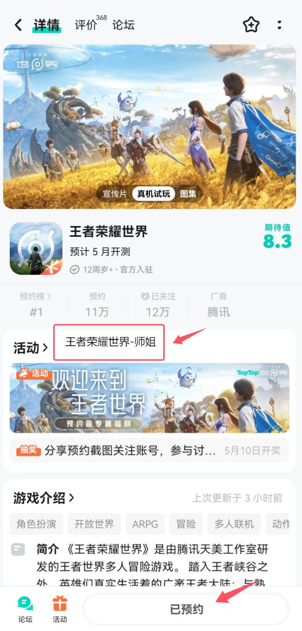 欢迎来到王者世界,师弟师妹们大家久等了!师姐带来了一个好消息,《王者荣耀世界》已经正式在TapTap开启预约啦!![[表情_开心]](https://img-tc.tapimg.com/market/images/48516f625646b5ea2c66f0cab3c9c52a.png)