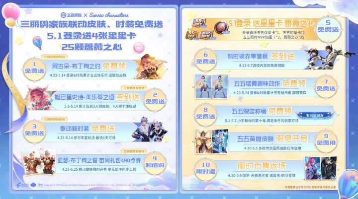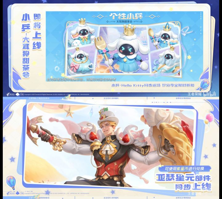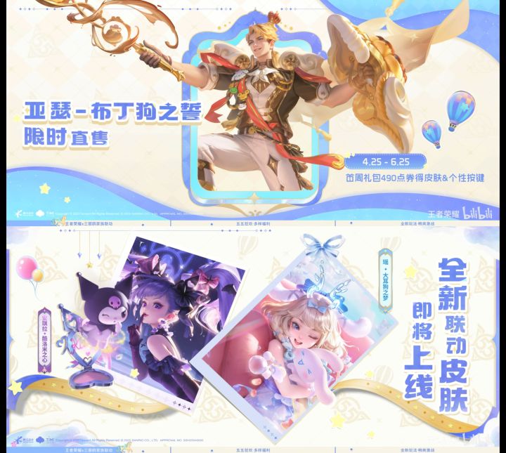 2025年4月23日,王者荣耀进一步公开了三丽鸥主题五五开黑节的详情,亚瑟有免费星元可以兑换,但依旧未公开瑶和安琪拉的联动皮肤具体获取方式。