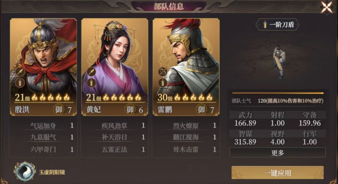 殷洪+黄妃+雷鹏,加点全智力。殷洪提供全队减伤和续航回复,黄夫人概率补伤害或回血,再由雷鹏打出多段智谋伤害。该阵容优点是续航能力强且成本较低,缺点在于减伤受限,且缺乏增伤手段,爆发能力一般。