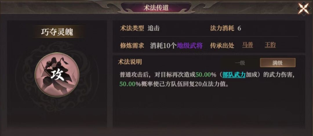 T0级武力伤害型术法。普攻触发额外追击伤害,且最高有50%概率回复20点法力值。伤害高可回蓝,而且是追击术法,泛用性极高。