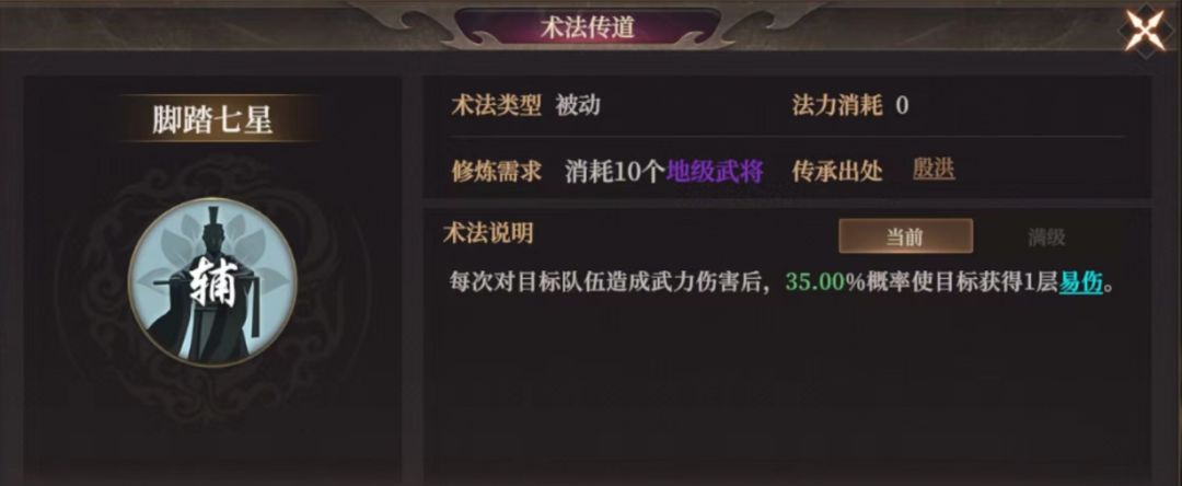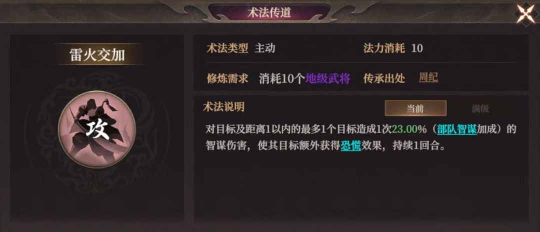 满级对最多3个目标造成14%的智谋伤害,并提升10%其受到的智谋伤害。智谋群伤型武将可带,尤其是雷鹏、崇黑虎、雷震子这种高爆发型武将更适合。