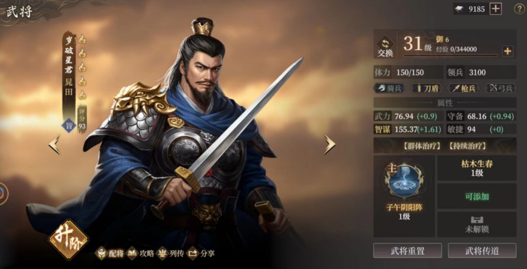群体治疗辅,自带术法【枯木逢春】满级可回复最多3只队伍的血量,且回复系数较高,可达到30%+28%*2=86%,在异兽、攻城中都能有不错表现。灵宝【子午阴阳阵】最高提升全队40%智谋和守备,持续一回合。数值给的很足,搭配高爆发智谋型武将,对伤害上限的提升非常明显。