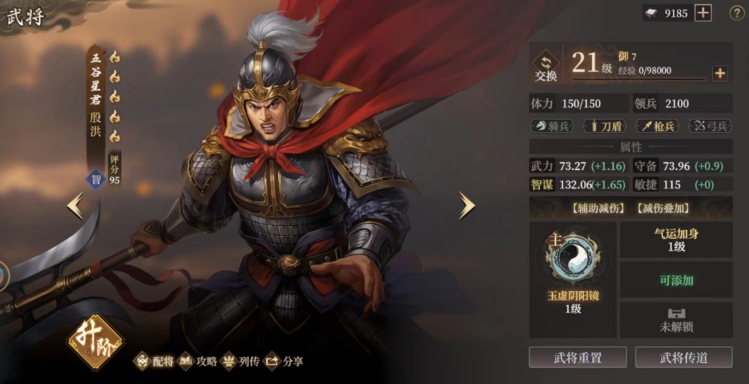 T1级别减伤辅,打刀盾、枪兵时效果更好。自带术法【气运加身】,针对距离1以内的敌人造成的伤害,每回合提供最多5次20%减伤效果。对上夫妻弓、燃烧弓之类带减速的远程阵容会比较吃亏。更大的价值在于其灵宝【玉虚阴阳镜】,满级提供200%治疗和60点回蓝,大幅提升全队续航能力。该效果大大提升了殷洪的战术地位。