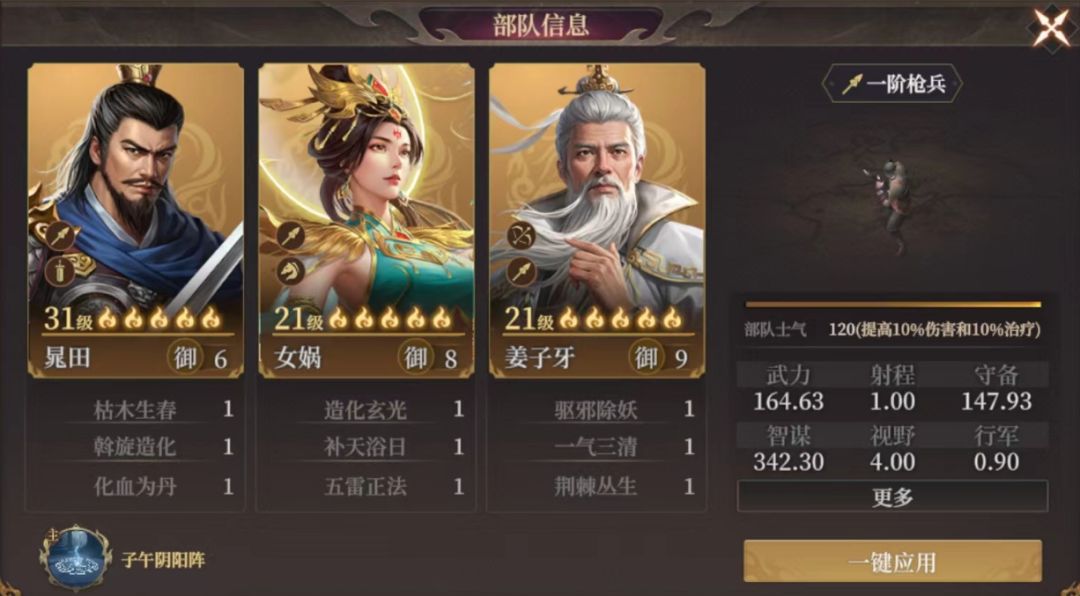 晁田+女娲+姜子牙。带枪兵,加点全智谋。姜子牙和女娲机制简单数值超群,在提供巨额爆发伤害的同时,给到缴械控制。晁田提供属性加成和持续治疗,提升队伍在智谋爆发和生存能力两端的上限。