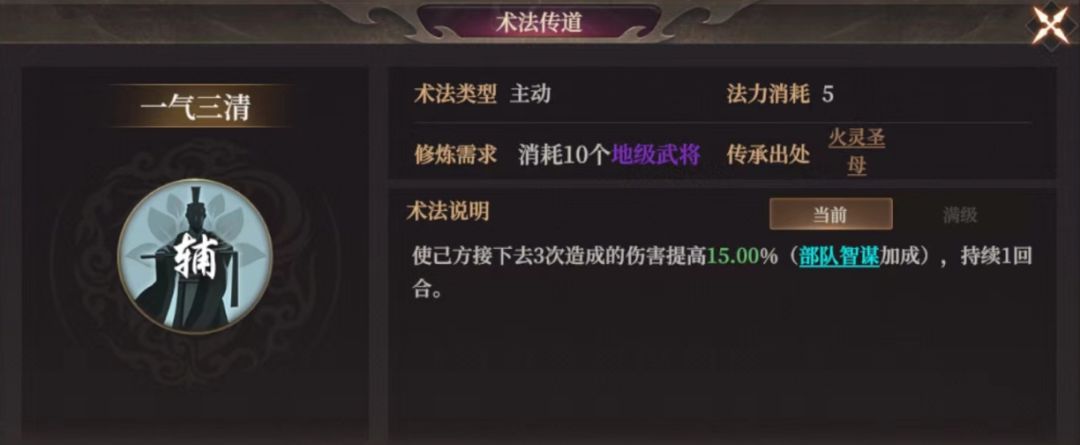 满级可使己方接下来3次造成的伤害提高30%,持续1回合。注意没规定伤害来源是术法、普攻、异常状态还是灵宝。这就使得该术法拥有极高的增伤上限。比如触发效果的是崇黑虎灵宝【玄烟化鹰葫】,那么满级伤害倍率就将达到460%*1.3=598%。