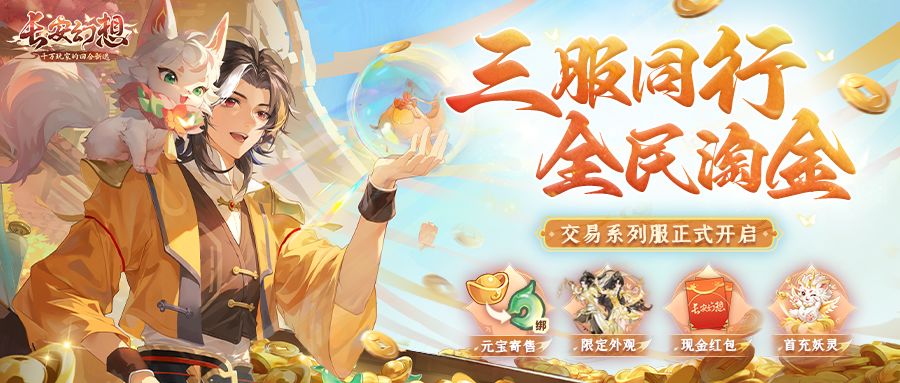 盛世鎏金,全民淘金!长安幻想首次货币革命即将拉开序幕,专属于各位御灵师的全民大淘金时代就要开始了!在这么重要的时间点,猪师兄给御灵师们也准备了丰厚大礼与交易系列服,助力各位御灵师在这次淘金热潮中完成暴富梦想!