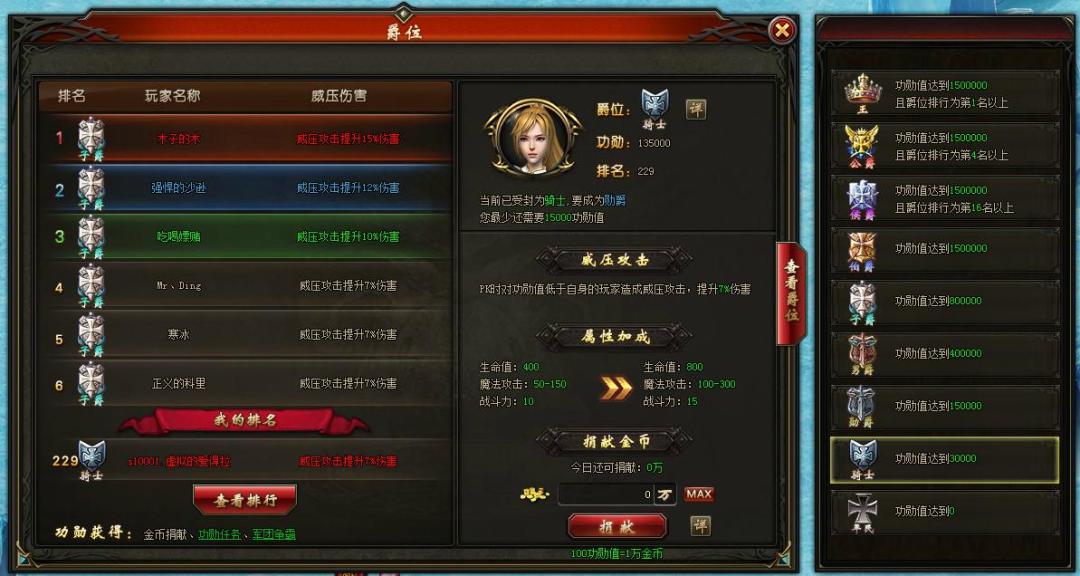 王国将根据玩家的经济实力,并对在困难时期大公无私,慷慨解囊资助王国,对王国做出卓越贡献的玩家加官进爵,资助排行前16名的玩家将得到王、公爵、侯爵的爵位分配,每个爵位的人数设立有限。而16名外没有爵位的玩家可根据伯、子、男、勋爵、骑士的册封条件,进行爵位分配,只要达到该爵位册封条件即可被册封,人数不限。一旦获得爵位册封,不但能受到众人的仰慕,而且能得到相应的战斗力加成哦!爵位系统共分为8级,每级可增加不同的战斗力