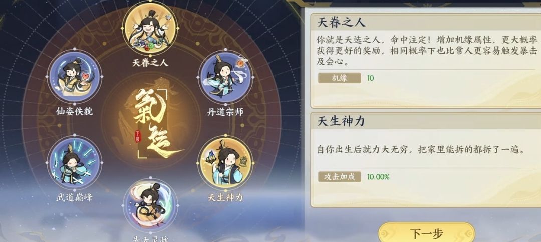 【天生神力】+【天眷之人】:攻击力提升10%推图效率翻倍,10点机缘兼顾挖宝暴富与暴击率加成,性价比碾压炼丹师(药材难刷,每日限嗑1丹)。