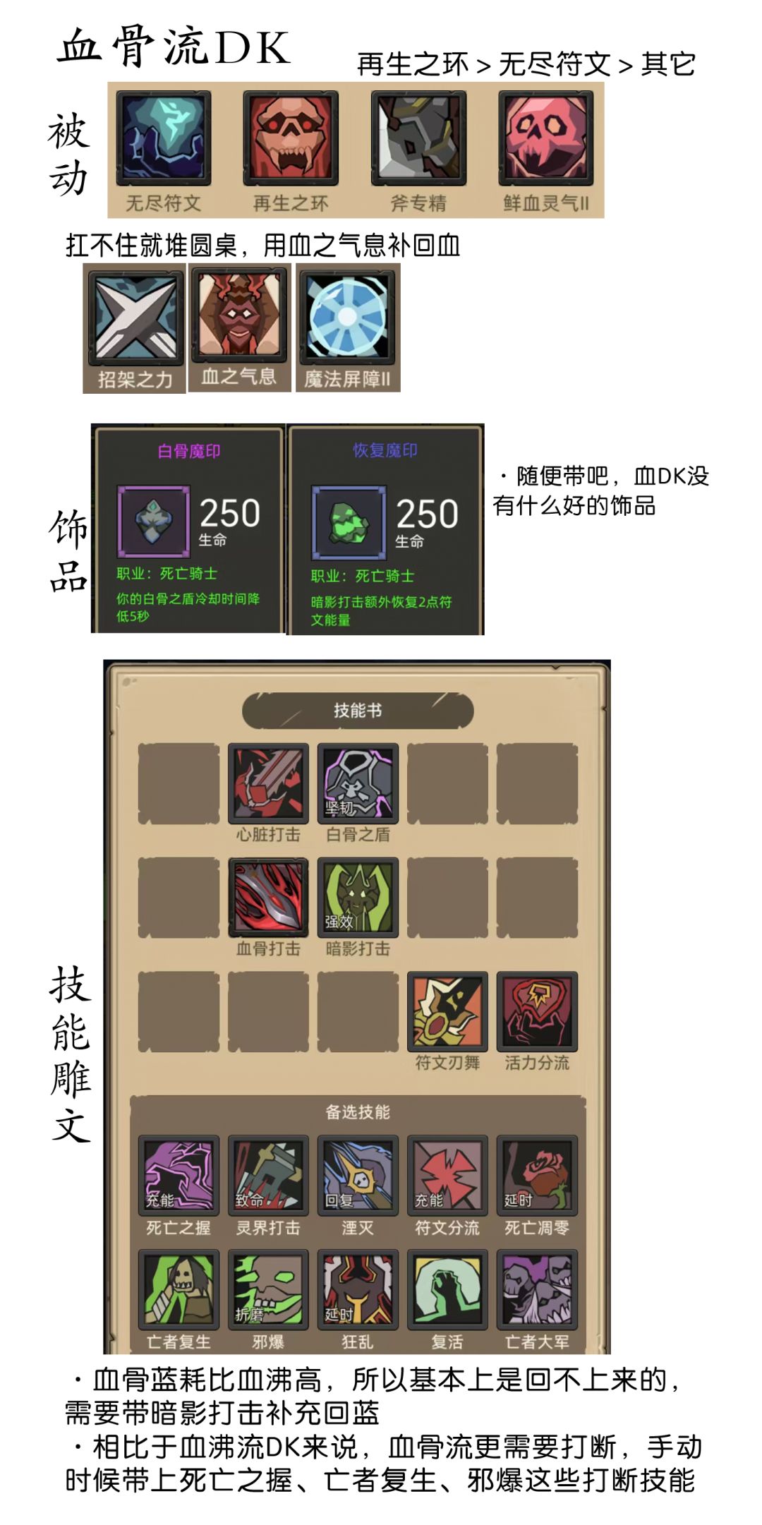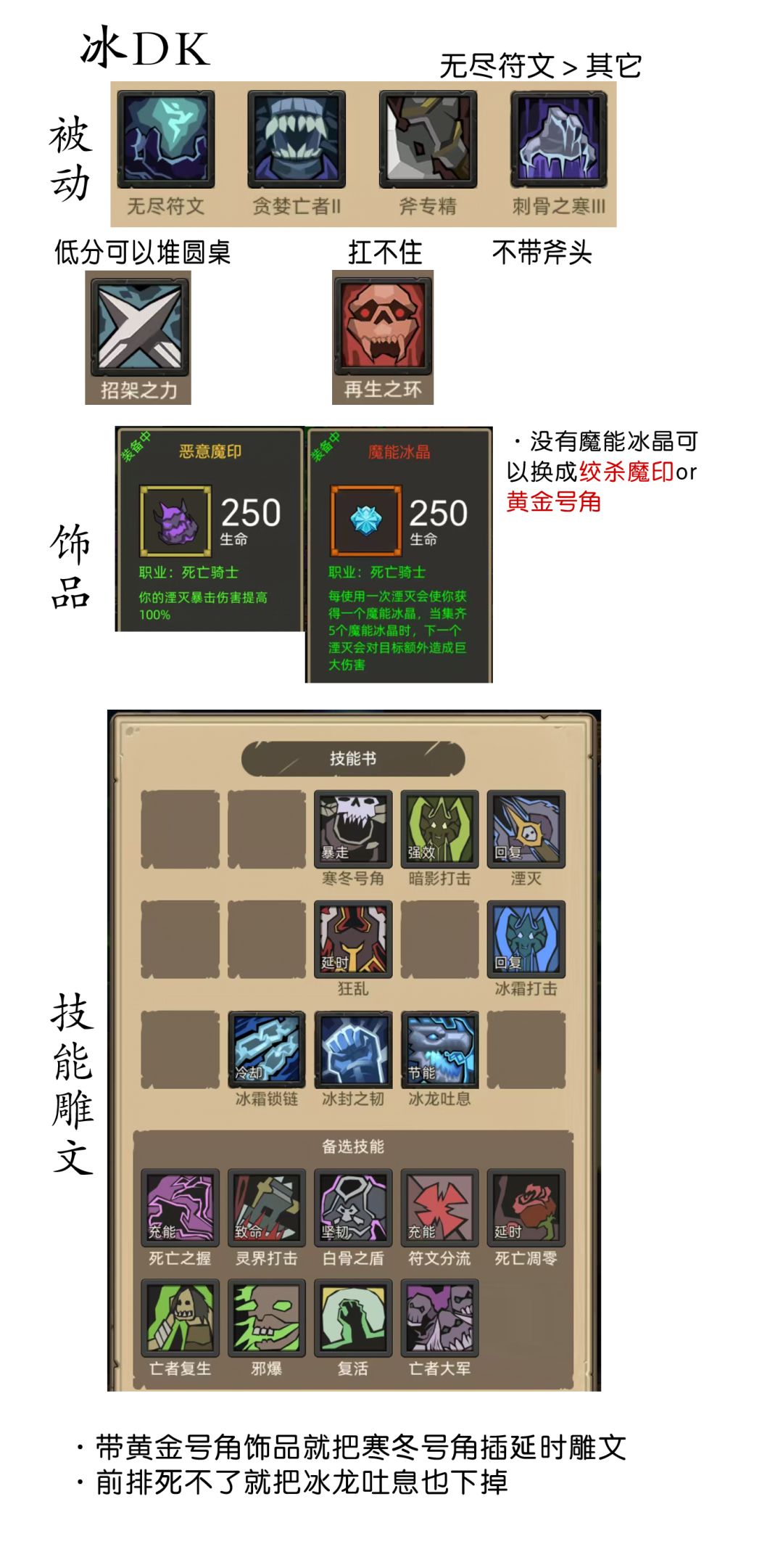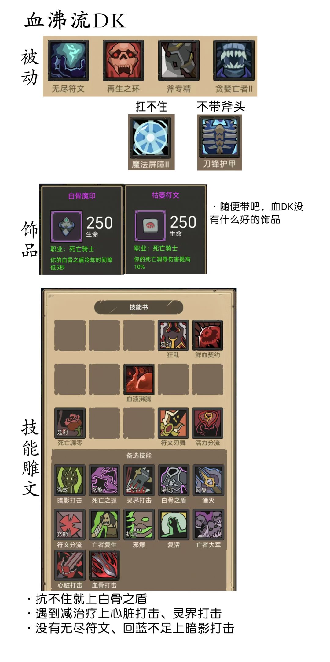 - 4月25日修正:感谢各位给出的思路,原来邪DK还能玩,这里根据游戏经验来云一下吧(满急速回避,堆全能精通,装备可以穿350套装,也可以换船长套,主手招架剑,副手攻速匕首,项链用340血项链再生精华或者340红项链军团秘钥,戒指一个攻速一个10%治疗量,依靠满圆桌和召唤物减少伤害,被动必带血环和招架。思路就是减少单次受到伤害,依靠血环和项链回血来保证生存,自身就是个召唤骷髅的机器,提高攻速加快召唤频率,失去了蓝武也还有25%的破甲,召唤物还是有输出的。就这些了,慎重参考