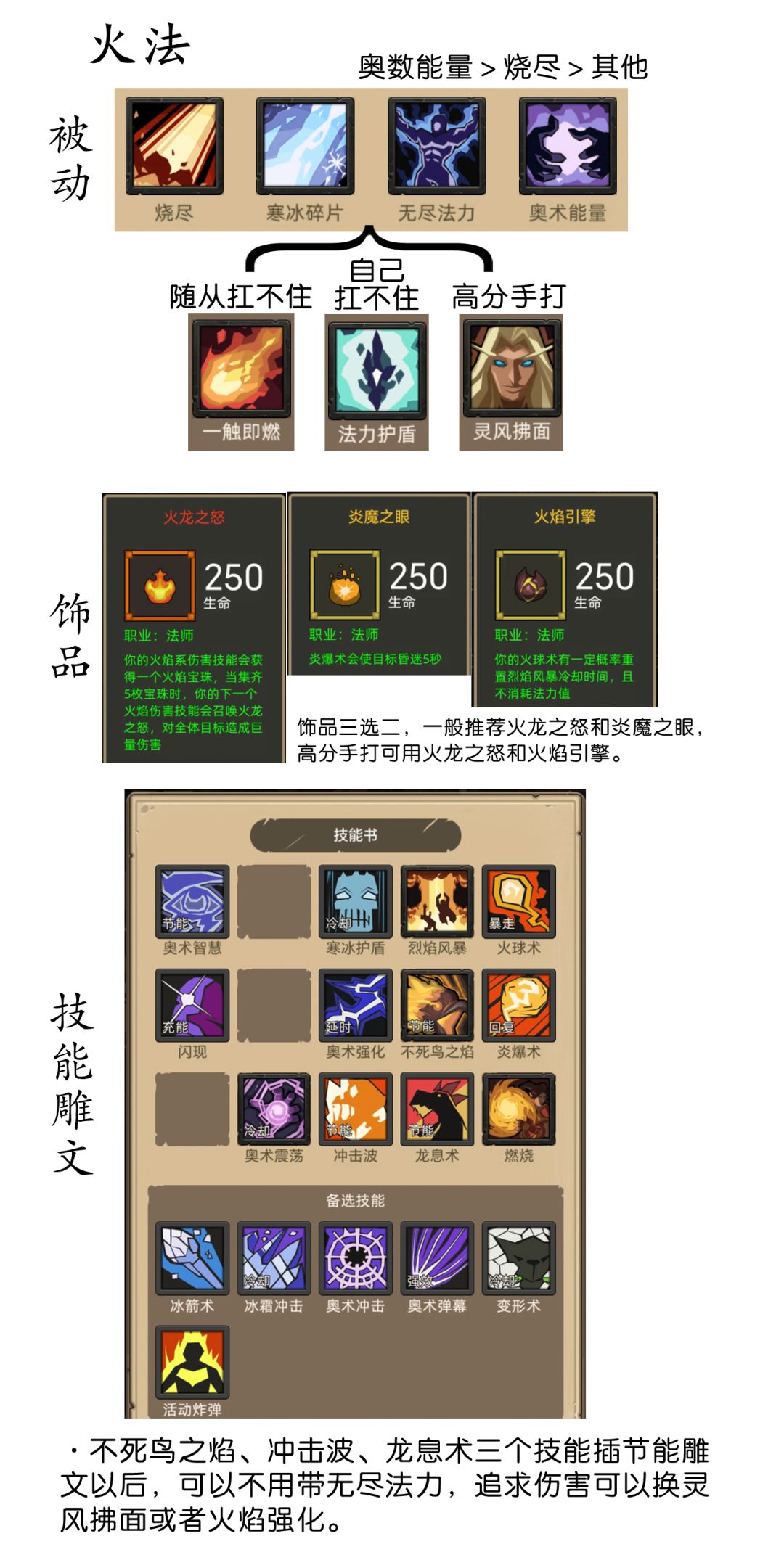 所有装备都不急着换的一个职业,有350的暗炎学士或者魔能晶化套都可以继续使用,甚至如果不嫌弃攻强低的话枯叶戒指也是最优选,目前火法比较难打的两个本是巨魔陵墓(减30%暴击率)和泰坦密室二号(40%血以下免控,还会冲锋)前者会让火法续航出大问题,所以有条件的话可以买无尽法力,实在不想买的话可以刷个军团版本的4回魔杖,后者需要控血量,在差不多50%血的时候控制输出节奏,打断穿刺冲锋以后全力输出(需要一定评分,当然也可以切奥法打,相对来说奥法更容易打这个本)