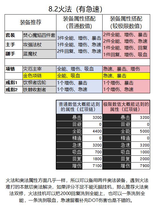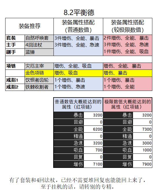 属性:暴击、急速3120(装备3条+戒指1条,急速挂机可以不要),增伤>全能,吸血1条(约1.5%),回复2条(约20%)