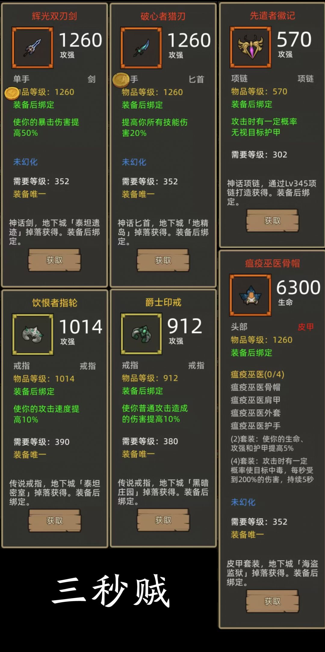 - 三秒贼:瘟疫巫医4件+爆伤剑(辉光双刃剑)+技伤匕(破心者猎刃)项链:先遣者徽记,戒指:饮恨者指轮+爵士印戒(390+380攻强戒指)