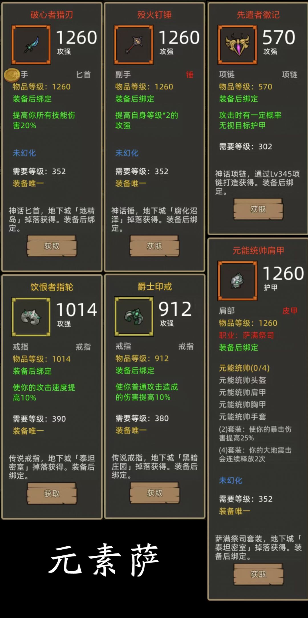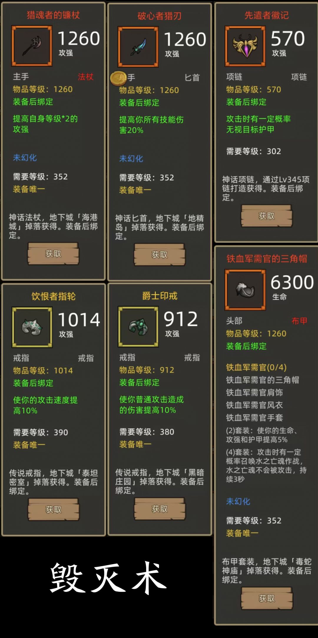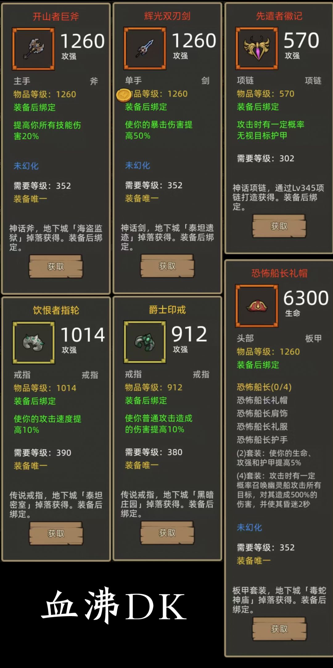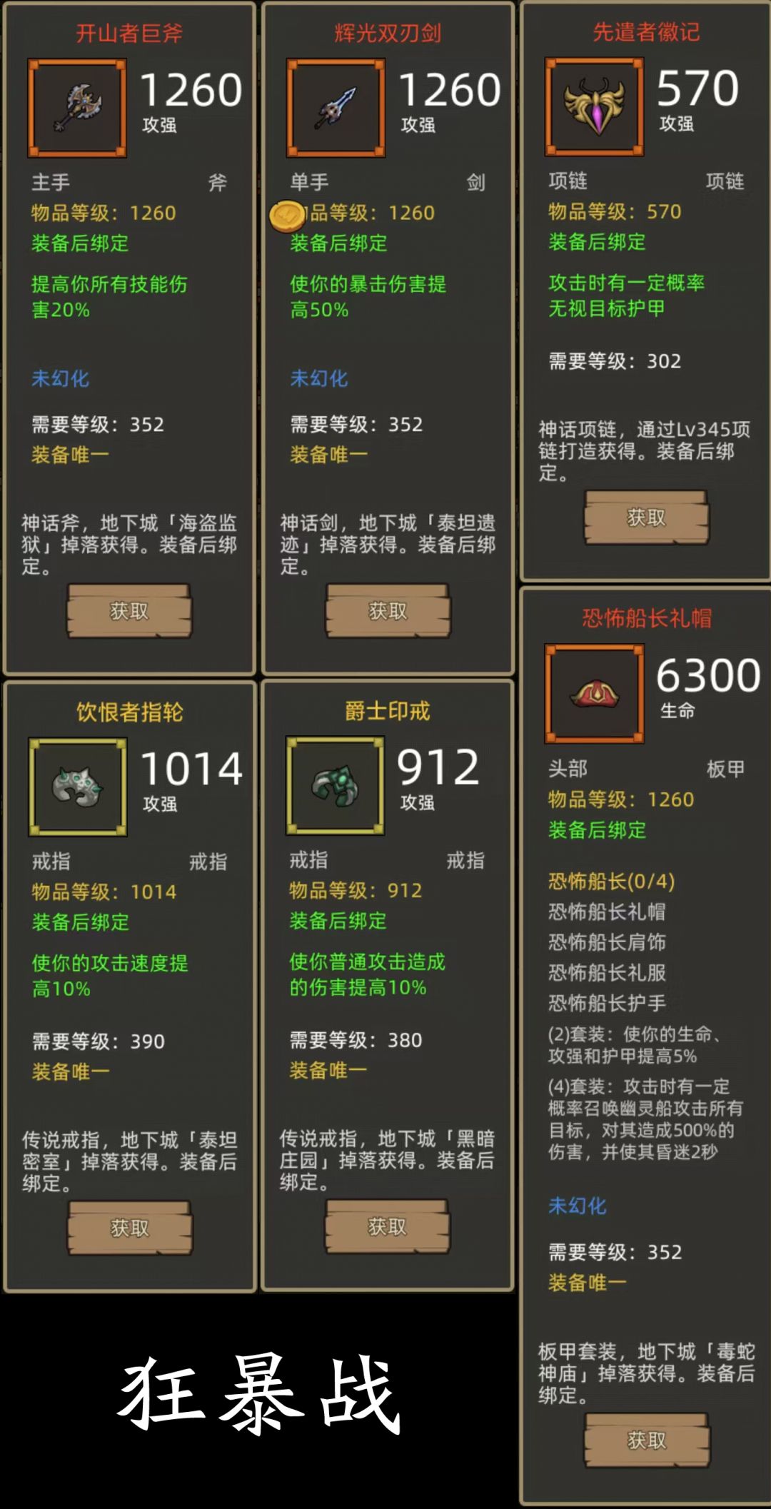 - 恐怖船长4件+技伤斧(开山者巨斧)+爆伤剑(辉光双刃剑)or技伤匕首(破心者猎刃)项链:先遣者徽记,戒指:饮恨者指轮+爵士印戒(390+380攻强戒指)