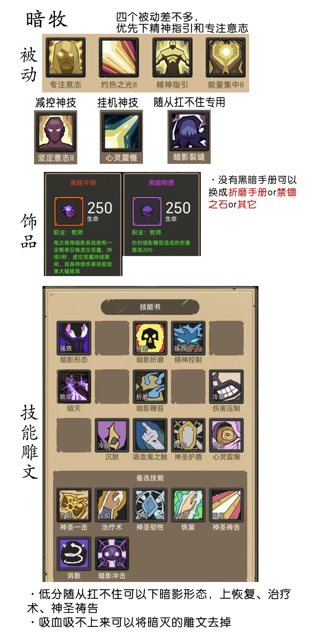 有红饰品再玩,没有的话还是痛苦术稳。新版本多了血能转换这个专为手打而生的被动,可以完全不要回复,多来点吸血就可以吸上来,比堆回复性价比高,带上被动以后无脑烧尽就行。因为布甲两个通用套都不怎么样的原因,所以如果不急着拉评分的话可以继续带上版本的装备,不急着换。