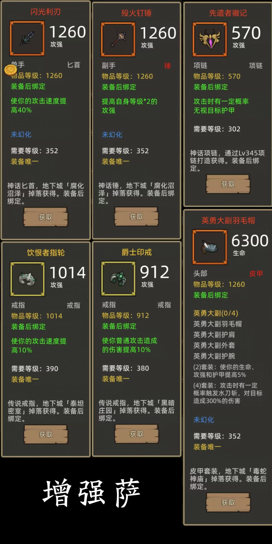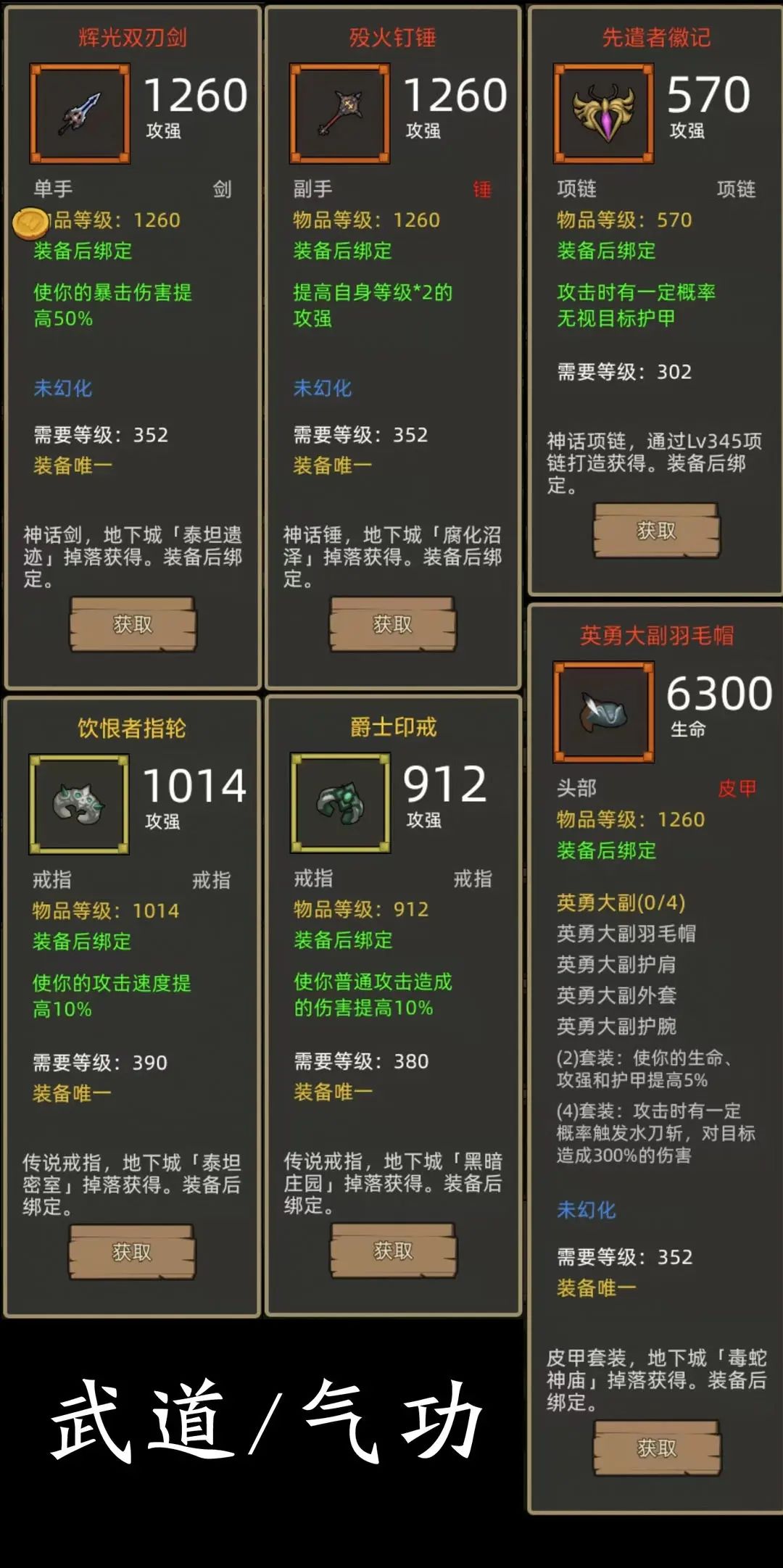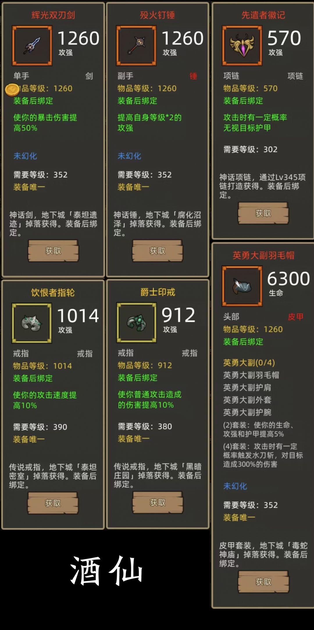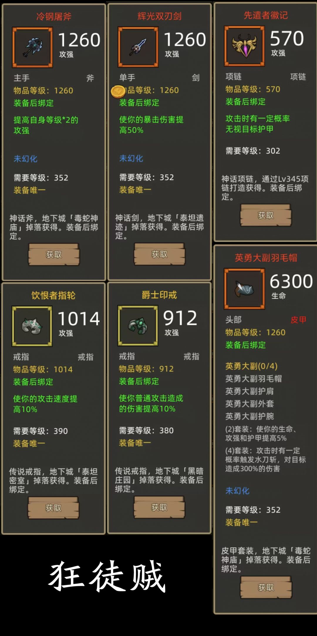 - 英勇大副4件+攻强斧(冷钢屠斧)+爆伤剑(辉光双刃剑)项链:先遣者徽记,戒指:饮恨者指轮+爵士印戒(390+380攻强戒指)