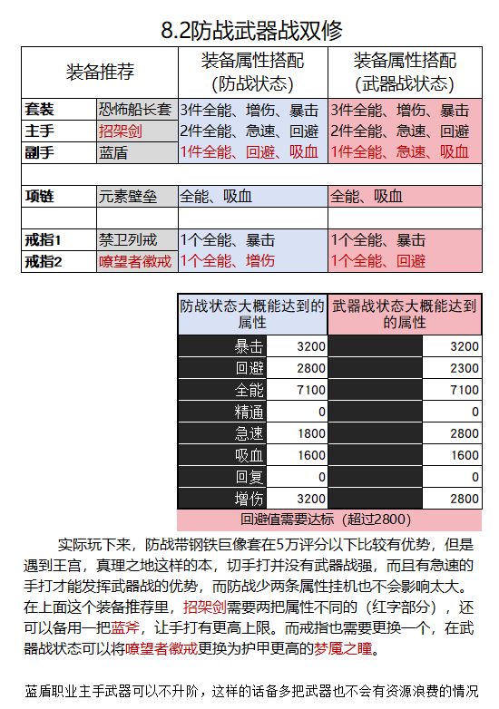 玩防战的一般是分不高的玩家,如果叠甲也扛不住的话可以把武器换成招架剑,堆满回避3120,防战有蓝盾以后输出会上一个台阶,挂机也能省去一半左右的时间,测试服里也试过,起手盾墙加天神下凡,被A了触发蓝盾以后攻击能到10万+,名副其实的数值怪了,但是哪怕是这个攻击力的防战,挂机下来也是没有武器战快。