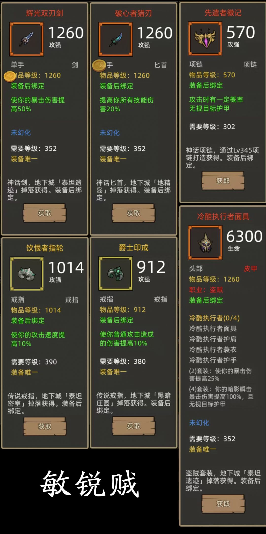 - 冷酷执行者4件+爆伤剑(辉光双刃剑)+技伤匕(破心者猎刃)项链:先遣者徽记,戒指:饮恨者指轮+爵士印戒(390+380攻强戒指)