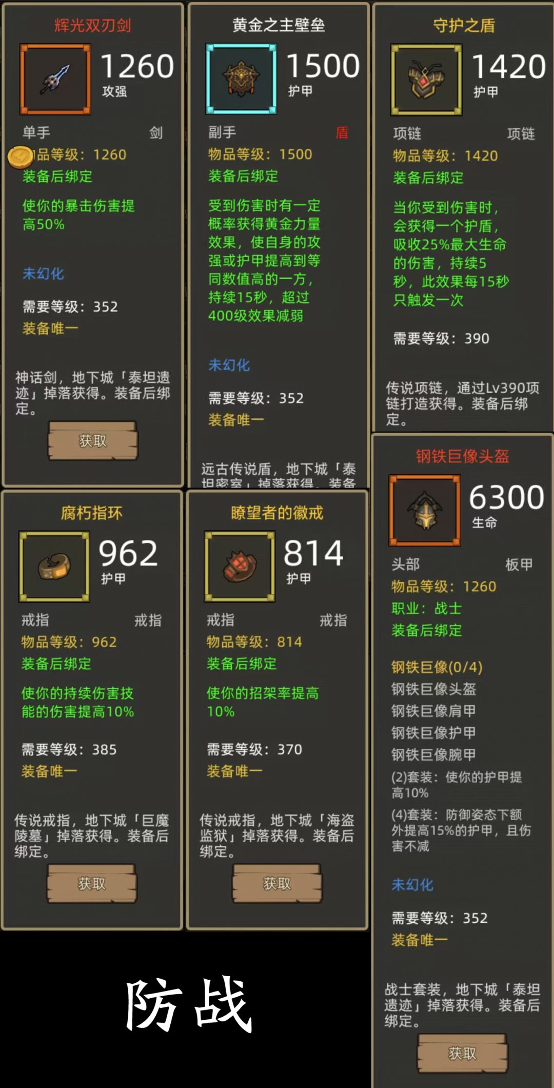 - 钢铁巨像4件+爆伤剑(辉光双刃剑)+黄金之主壁垒(蓝盾) 项链:守护之盾(390护甲项链)戒指:腐朽指环+瞭望者的徽戒(385+370护甲戒指)