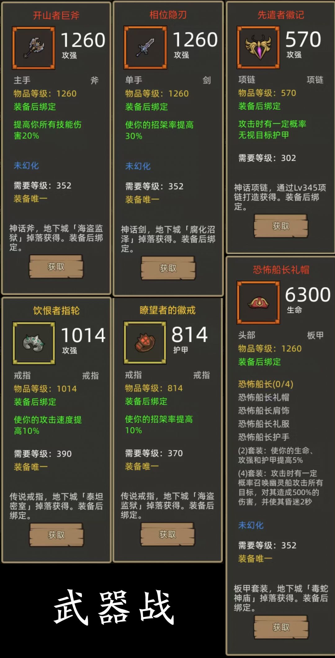 - 恐怖船长4件+技伤斧(开山者巨斧)+招架剑(相位隐刃)项链:先遣者徽记,戒指:饮恨者指轮+瞭望者的徽戒(390攻强戒指+370护甲戒指) 主手带斧子只是为了斧专精,也可以换爆伤剑(辉光双刃剑)或者攻强斧(冷钢屠斧)