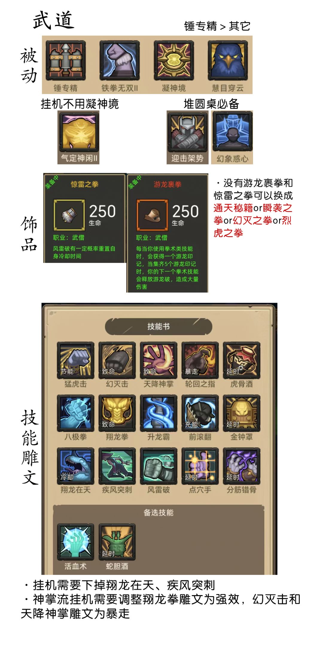 上版本该怎么挂机就怎么挂机,换套装备的事,新技能厄运诅咒挂机不会放,所以一切照旧,新被动血能转换挂机也不会用。手打的话回复不需要,被动带上血能转换,吸血再多1条,无脑放技能就行。