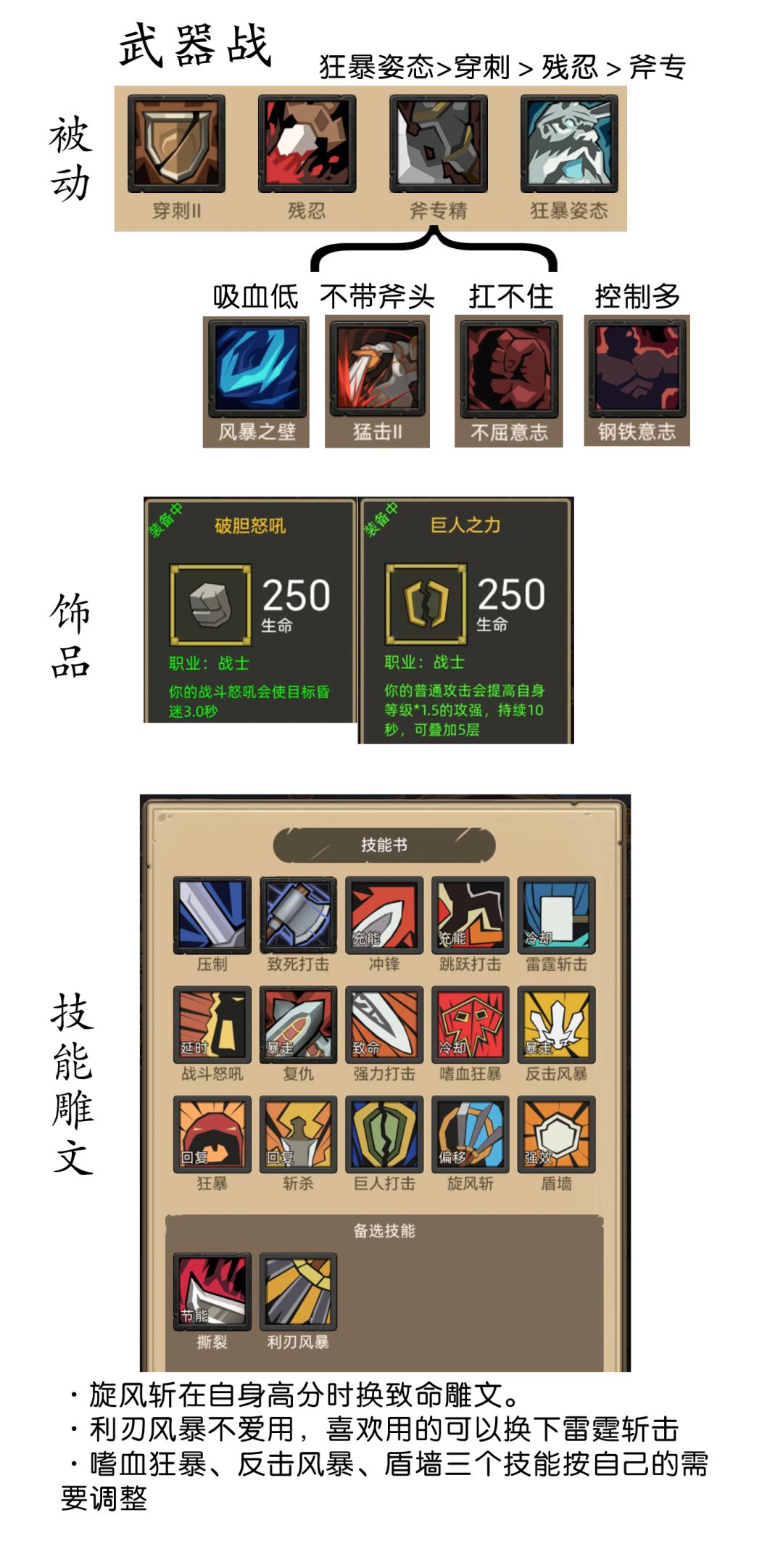 - 395版本更新:加入了暴击率斧和暴伤项链,狂暴战也多了加暴伤的技能,所以在两个鲁莽内打完的可以用双技伤武器,两个鲁莽以上打完的就用技伤加暴击率斧