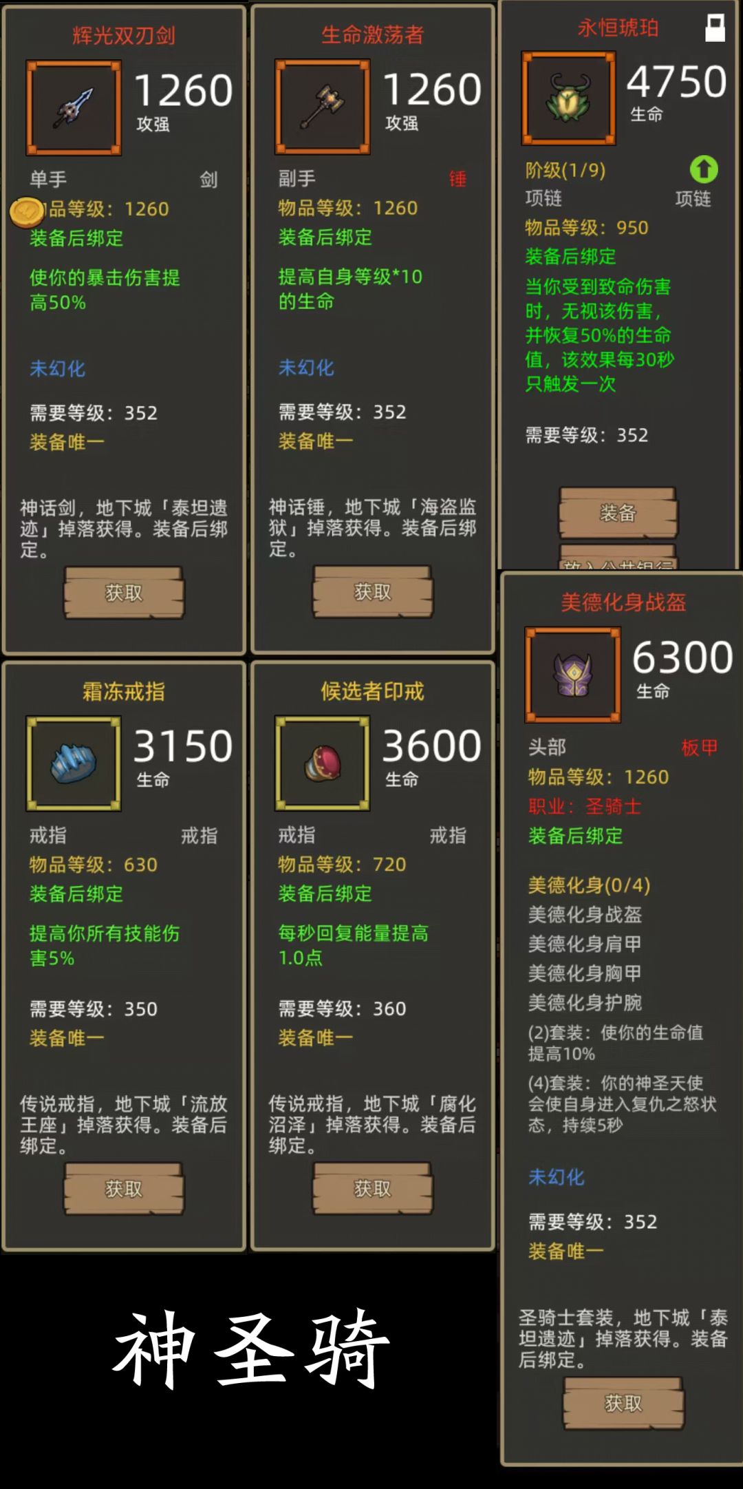 - 美德化身4件+爆伤剑(辉光双刃剑)+血量锤(生命激荡者)项链:永恒琥珀(390红项链),戒指:候选者印戒+霜冻戒指(360+350生命戒指)