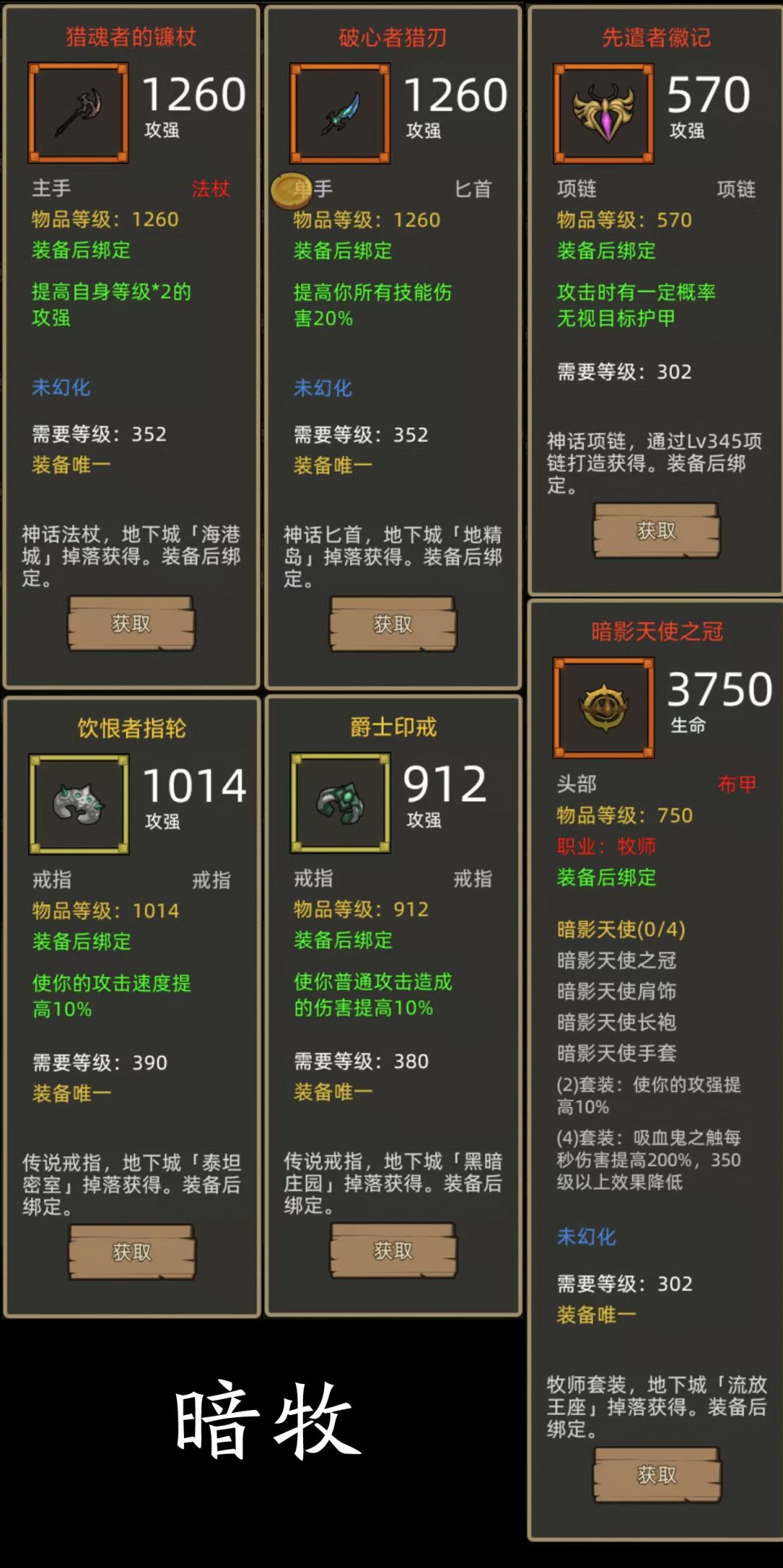 - 暗影天使4件+攻强杖(猎魂者的镰杖)+技伤匕首(破心者猎刃)项链:先遣者徽记,戒指:饮恨者指轮+爵士印戒(390+380攻强戒指)