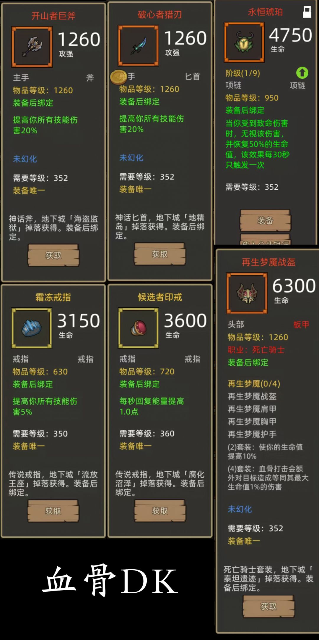 - 再生梦魇4件+技伤斧(开山者巨斧)+技伤匕(破心者猎刃)项链:永恒琥珀(390红项链),戒指:候选者印戒+霜冻戒指(360+350生命戒指)