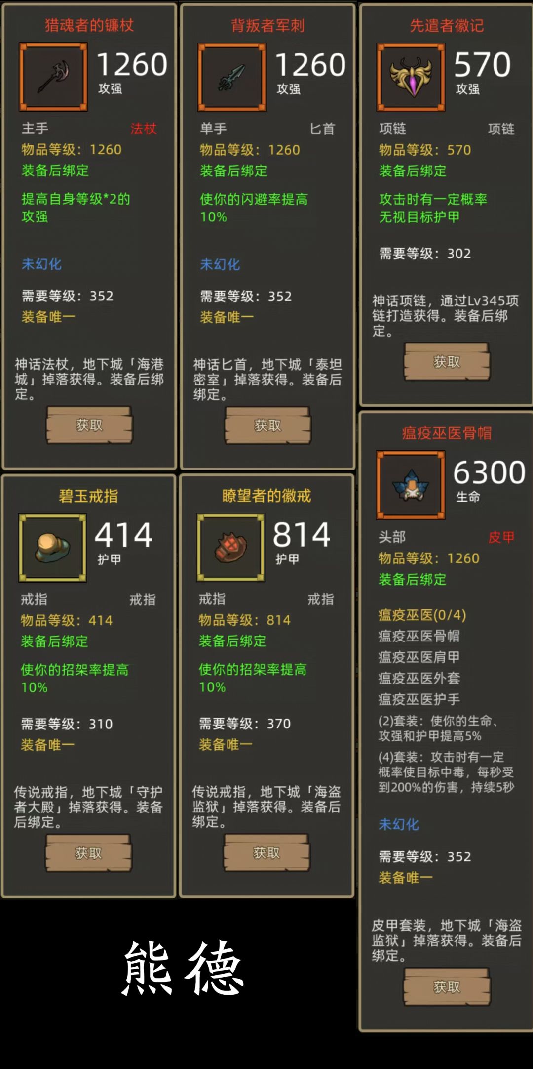 - 瘟疫巫医4件+攻强杖(猎魂者的镰杖)or海潮贤者法杖+闪避匕首(背叛者军刺) 项链:先遣者徽记,戒指:碧玉戒指+瞭望者的徽戒(310+370护甲戒指,两个10%招架戒指)