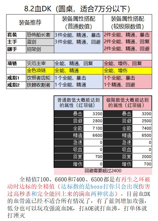 血DK目前两种玩法,血牛流主要打血骨打击,全堆生命值的情况下输出可观,也因全堆生命值的原因导致攻击较低,普攻输出占比低所以选择两把技伤武器。生命值高让被动血环能回更多的血,可以不再需要精通属性。血牛流血DK在低分到高分都有不错的表现。低分血DK玩家可以选择堆圆桌的打法,目前铁星有了9秒CD,圆桌血DK也不会有铁星因闪避而失效这个困扰了。