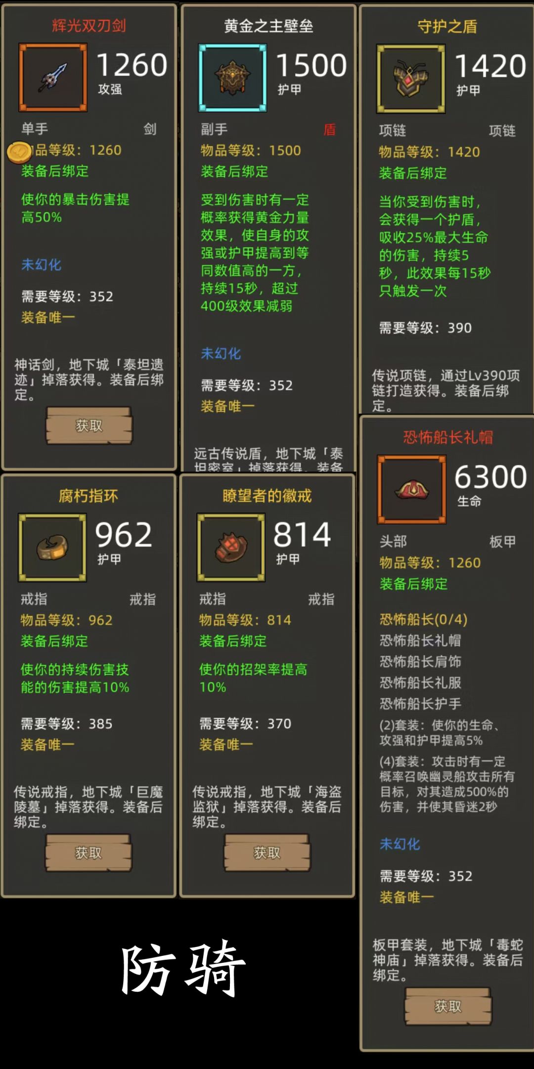 - 恐怖船长4件+爆伤剑(辉光双刃剑)+黄金之主壁垒(蓝盾) 项链:守护之盾(390护甲项链)戒指:腐朽指环+瞭望者的徽戒(385+370护甲戒指)
