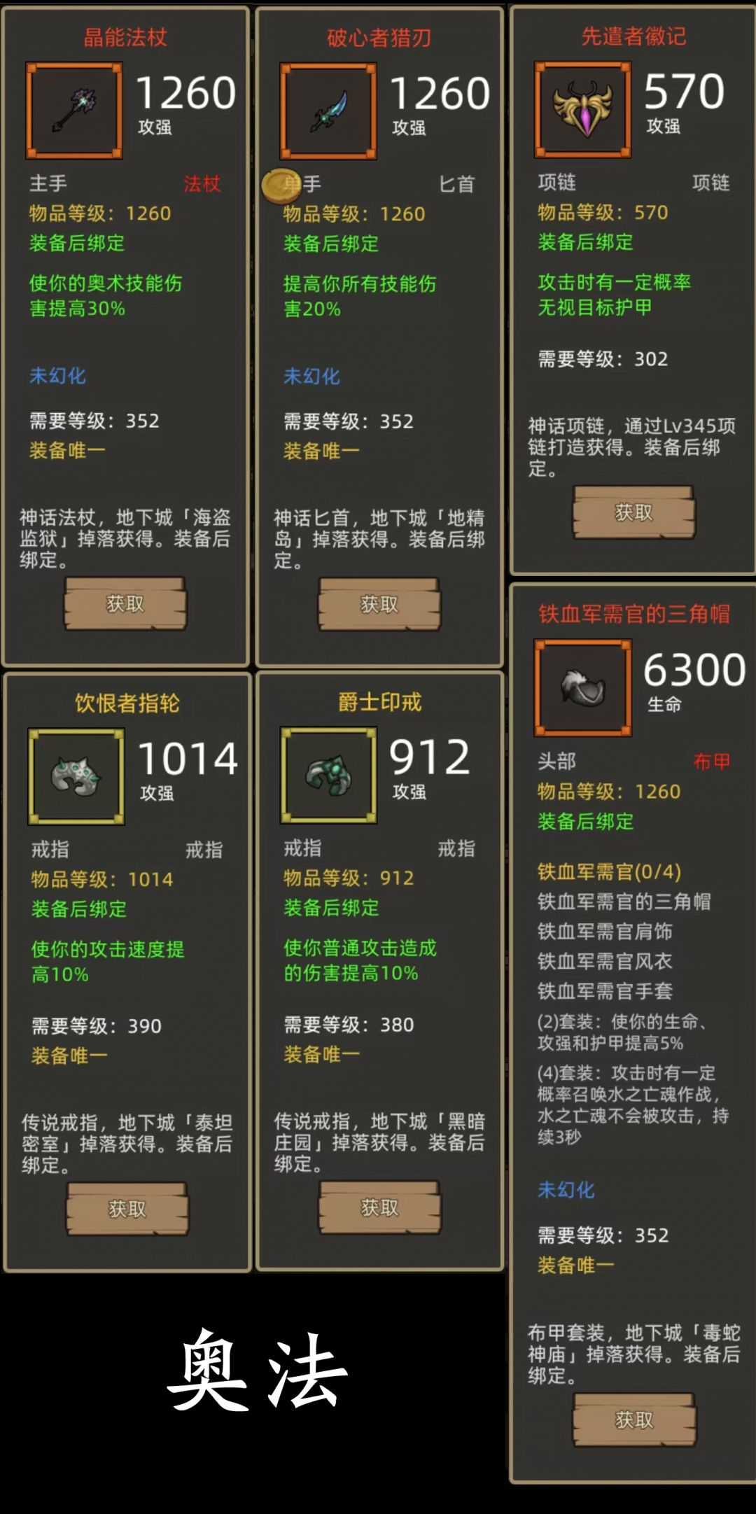- 铁血军需官4件+攻强杖(猎魂者的镰杖)+技伤匕首(破心者猎刃)项链:先遣者徽记,戒指:饮恨者指轮+爵士印戒(390+380攻强戒指)
