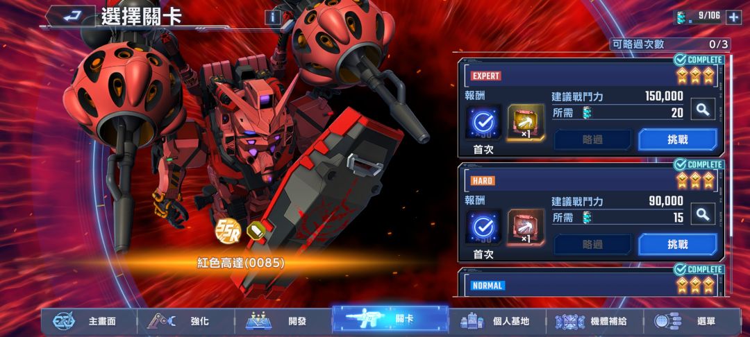 三个难度的体力需求分别是10、15、20。只建议刷最高难度,因为可以完成使命之余,机率获得SSR机,打一把获得13张机体金色经验卡。