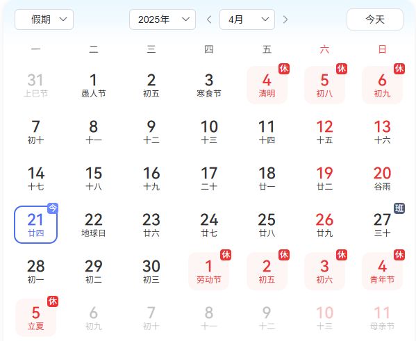 “这周要上6天班!”随着2025年劳动节假期的日渐临近,本周一开始,这一话题就迅速登上了热搜。今年五一假期将从5月1日(周四)至5月5日(周一)连休5天,但代价是节前的4月27日(周日)需补班,这导致本周工作日长达6天。社交媒体上,网友纷纷调侃“放假前的煎熬堪比渡劫”,而如何在高强度工作间隙“见缝插针”地摸鱼放松,成了职场人的新刚需。