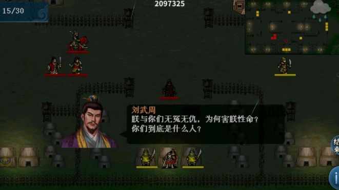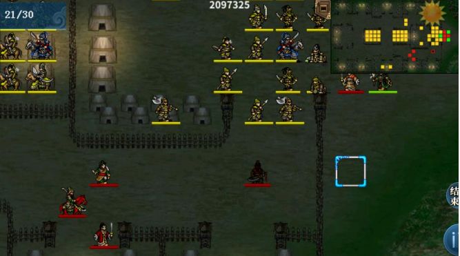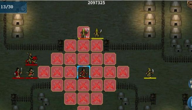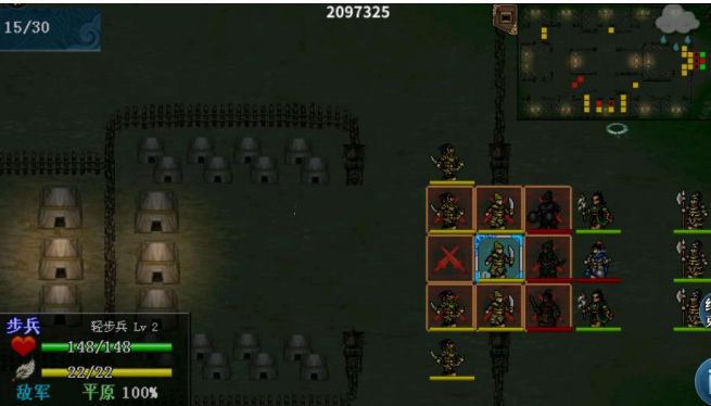 敌方回合,东门的营寨区域出现 15 个敌人(1 副将 2 智将 4 枪兵 4 力士 4 弓兵),除 2 个力