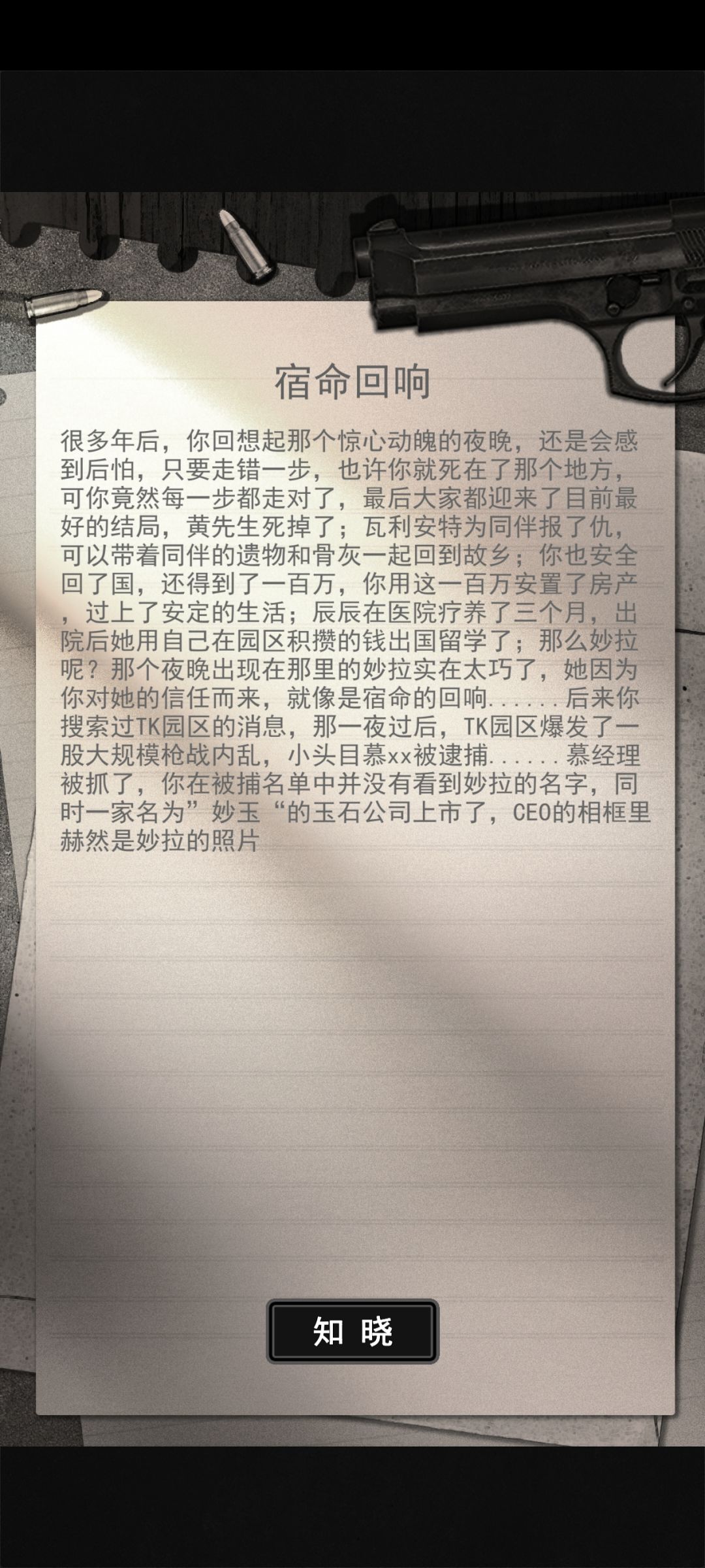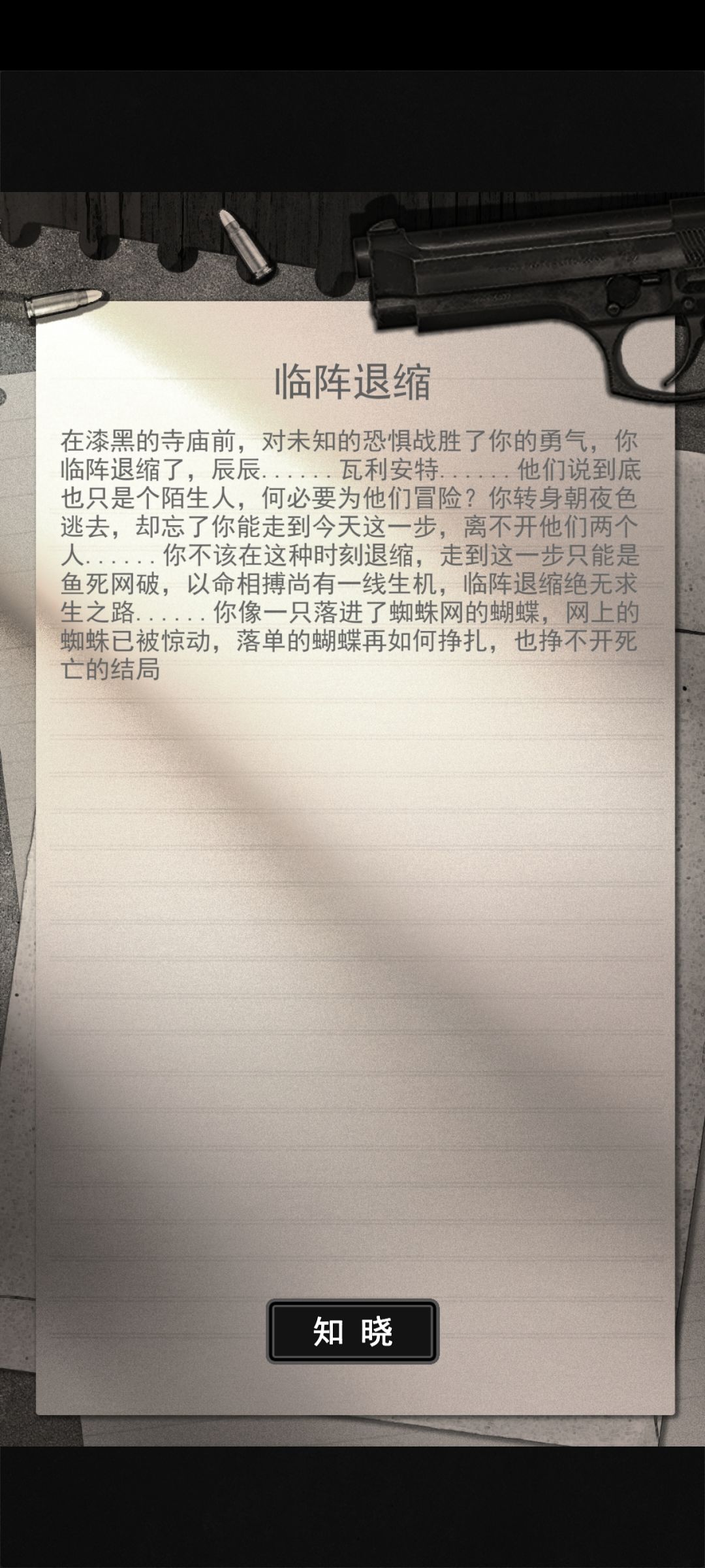 向妙拉询问辰辰/瓦利安特,并不恨她,选择进入寺庙,不冲进去,杀掉黄老板触发(全员存活)