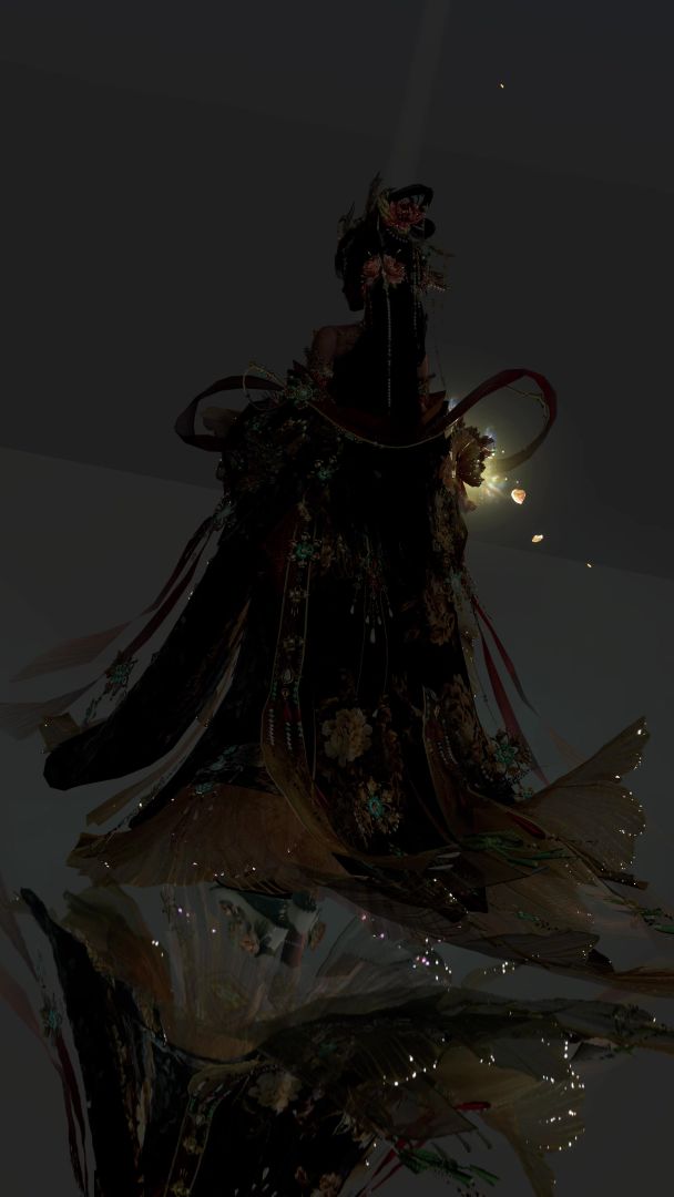 玉露繁云绣朝光,满城花影醉烟罗。苏绣非遗新时装【云绣露华】,以牡丹为灵感进行设计,以黑色的锦缎做为打底,用千色丝线绣出牡丹花瓣的自然渐变。牡丹沿着裙摆与披风次第绽放,仿佛盛世的缩影。